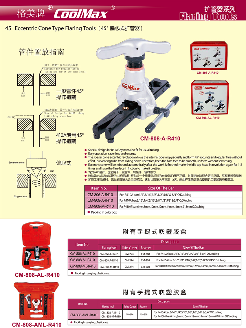 45°偏心式扩管器工具箱内含CM-808-A-R410A扩管器 、CM-808-M-410M专用底座、CM-274 切管刀、CM-208 铰刀