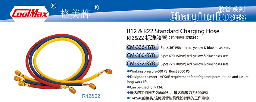 3条90cm专用于R12&R22标准胶管(红、黄、蓝),1/4" SAE 接头