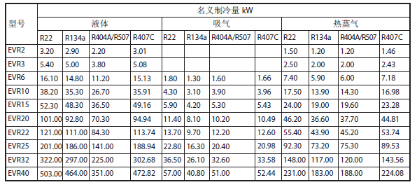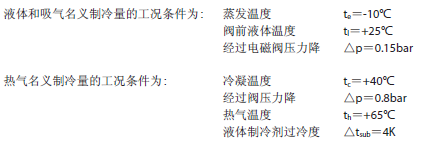 备注 名义制冷量的工况条件:液体和吸气:蒸发温度 Te=-10℃阀前液体温度: Tl=+25℃经过电磁阀压力降 △P=0.15bar热蒸气:冷凝温度: Tc=+40℃经过阀压力降:△P=0.8bar热气温度: Th=+65℃液体制冷剂过热度 △Tsub=4K以下数据基于以上工况,且电磁阀配好适合线圈后的名义制冷量(kw):液体:R22/R134a/R404A&R507/R407C 503/464/351/472.82吸气:R22/R134a/R404A&R507/R407C 57/40.8/51/52.44热蒸气:R22/R134a/R404A&R507/R407C 231/183/188/224.08