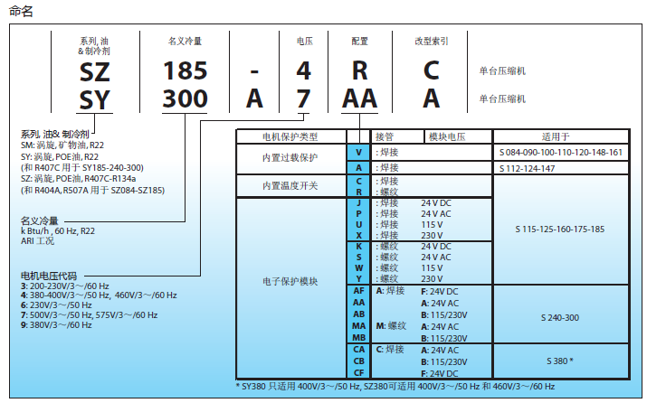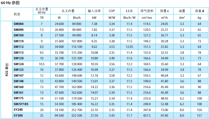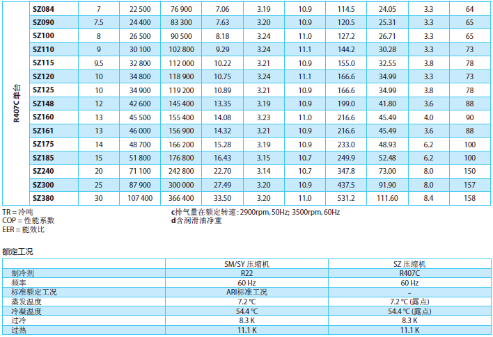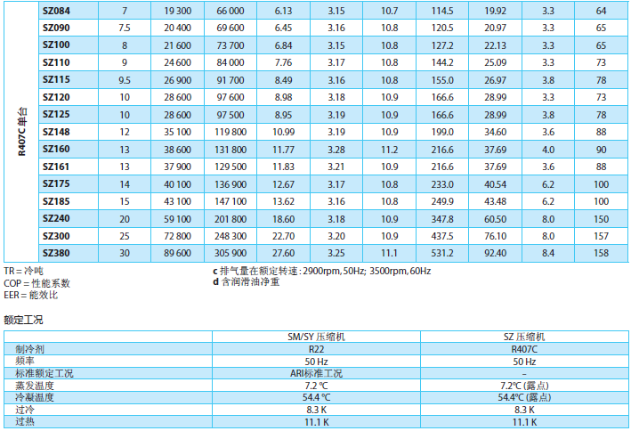 备注 50HZ/60HZ额定工况(SM/SY 压缩机)制冷剂: R22标准额定工况: ARI标准工况蒸发温度: 7.2℃冷凝温度: 54.4℃过冷: 8.3 K过热: 11.1K50HZ/60HZ额定工况(SZ 压缩机)制冷剂: R407C;蒸发温度: 7.2℃(露点);冷凝温度: 54.4℃(露点);过冷: 8.3 K;过热: 11.1K以下数据分别基于频率50HZ/60HZ的额定工况。排气量在额定转速:2900rpm, 50Hz; 3500rpm, 60Hz。净重含润滑油。