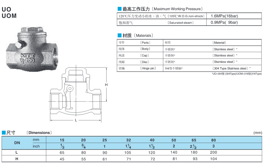 鼠标按住图片可看放大效果开滋/KITZ UO-DN15 不锈钢止回阀