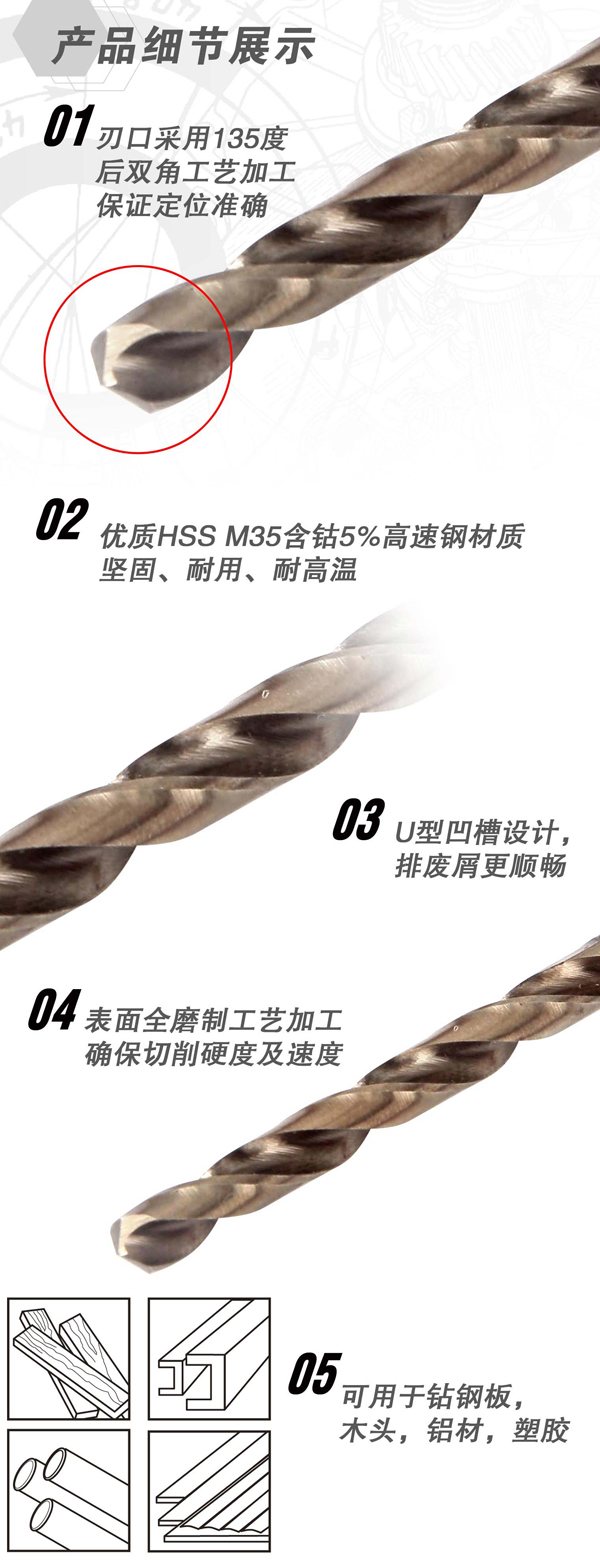 ·优质HSS M35含钴5%高速钢材质,全磨制工艺加工,确保切削硬度及速度