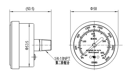 5. 捷锐减压器用压力表GR20B-600,2"轴向,600psi,1/4"NPT