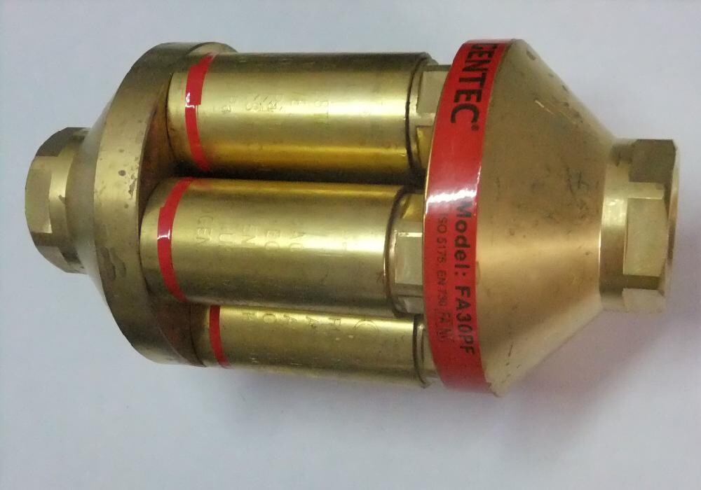 连接在乙炔、丙烷汇流排的低压管路上使用,内部的微孔火焰熄灭装置,确保火焰熄灭。单向阀可在回火时将气源切断,确保低压管路发生的回火不至于打到高压管路内。