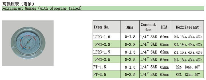 6. 充油压力表,椰树,1/4" SAE接口,多刻度,0~1.8mpa,表径62mm