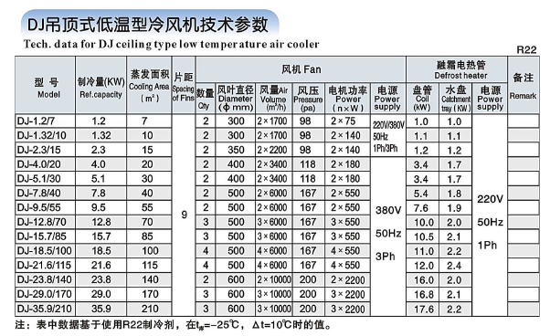 备注 以上数据基于使用R22制冷剂,在t库=-25℃,△t=10℃的值
