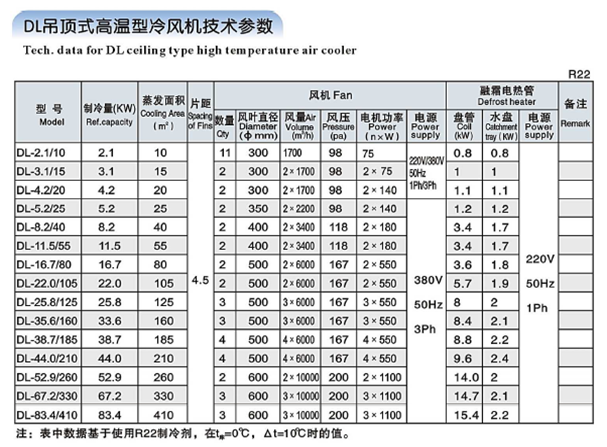 备注 以上数据基于使用R22制冷剂,在t库=0℃,△t=10℃的值