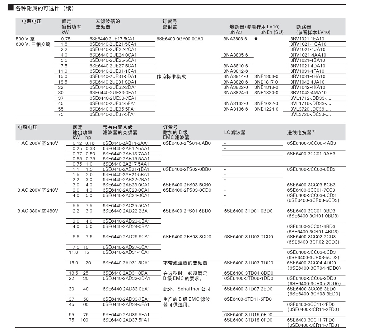 6SE6440-2AD24-0BA1 380~480 三相 10.2 4 不含 内置 内置 B 149×172×202 3.4 IP20