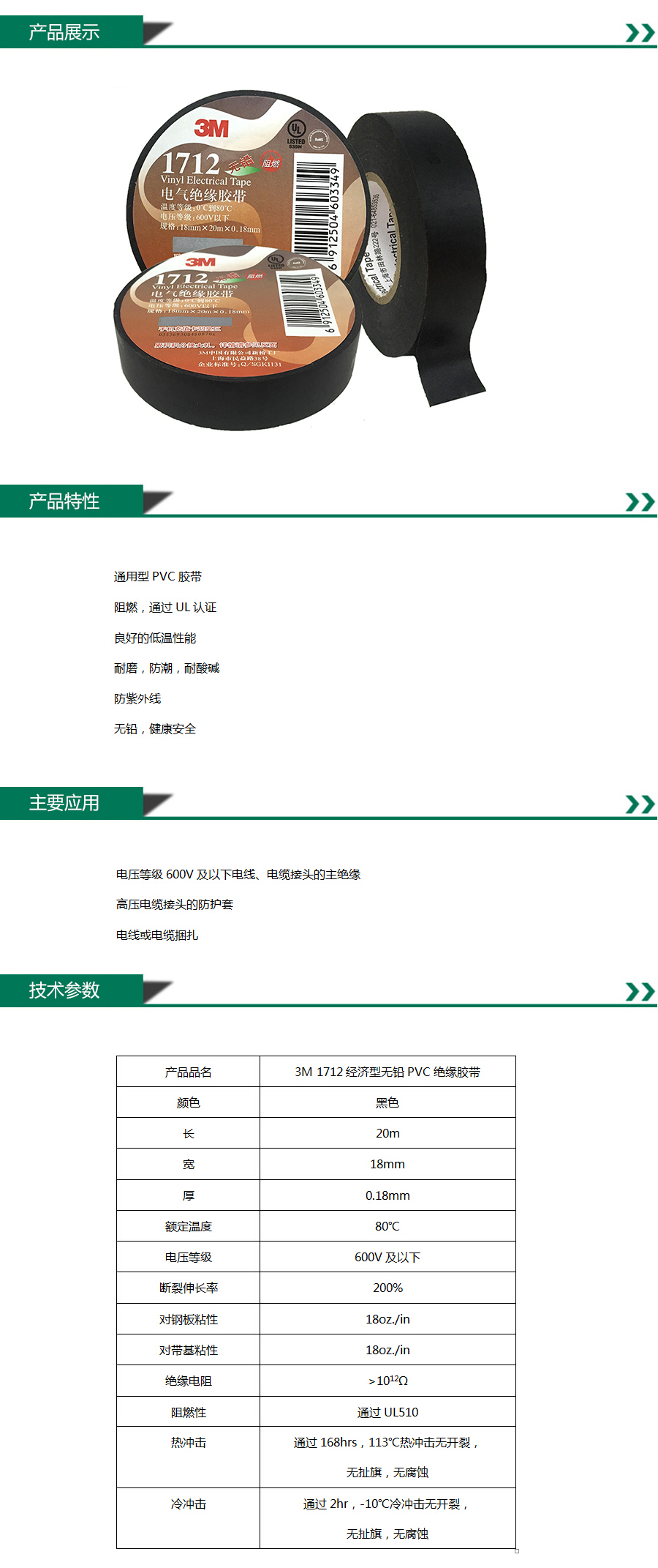 鼠标按住图片可看放大效果3M 电工胶带,1712# 黑 18mm×20m
