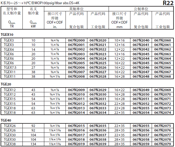 TGE系列膨胀阀名义冷量基于ASERCOM标准:蒸发温度4℃,开启过热度4℃,冷凝温度38℃,液体温度37℃