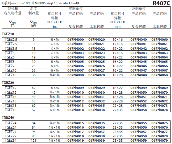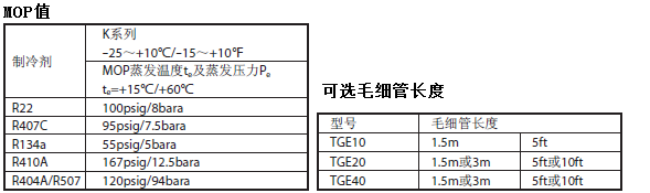 TGE系列膨胀阀名义冷量基于ASERCOM标准:蒸发温度4℃,开启过热度4℃,冷凝温度38℃,液体温度37℃