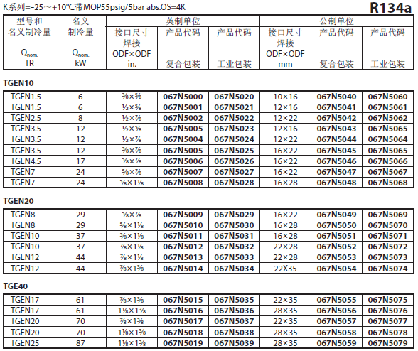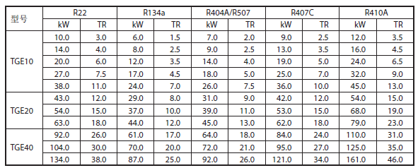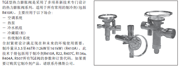 TGE系列膨胀阀名义冷量基于ASERCOM标准:蒸发温度4℃,开启过热度4℃,冷凝温度38℃,液体温度37℃