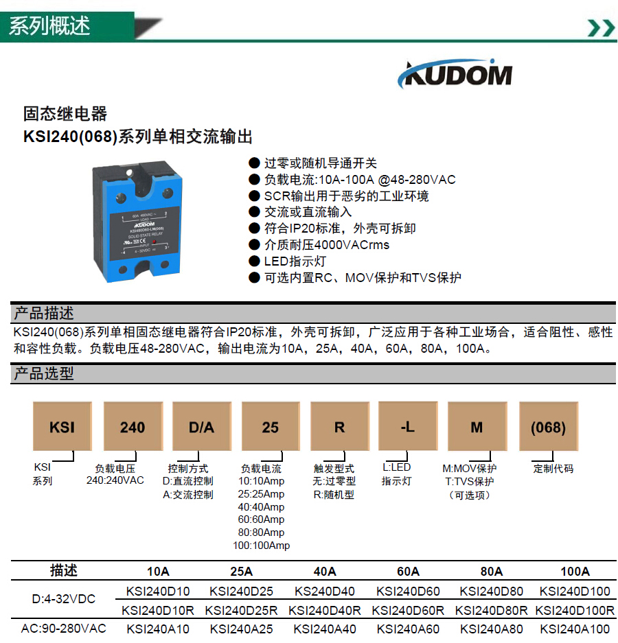 库顿 单相面板安装交流固态继电器,KSI240D60-L 60A 48-280VAC 4-32VDC控制