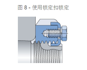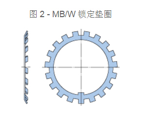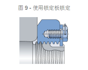 锁定垫圈、锁定扣和锁定板是简单、稳固且可靠的紧固件,可以啮合轴或紧定套中的键槽。 垫圈的一个定位齿弯入螺母上的某个凹槽中,可将螺母固定在给定的位置上(图7)。 锁定扣和锁定板通过螺栓固定在螺母上(图 8 和图 9)。